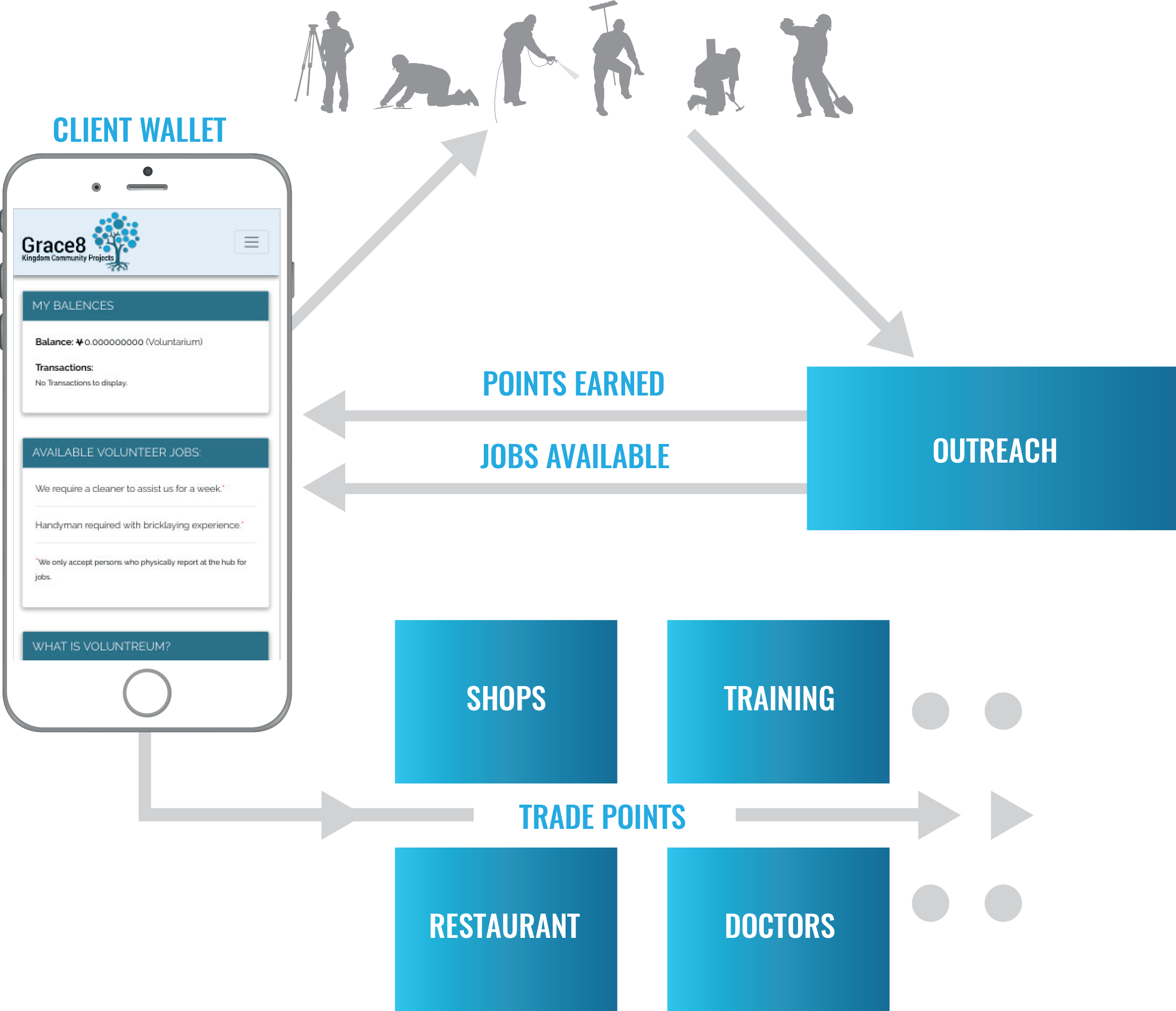 Community members are registered on the Grace8 Point system and earn points by participating in community outreach projects. This enables them to exchange their earned points for services, benefits and products available at the hubs. These services and benefits are addressed in the various disciplines.